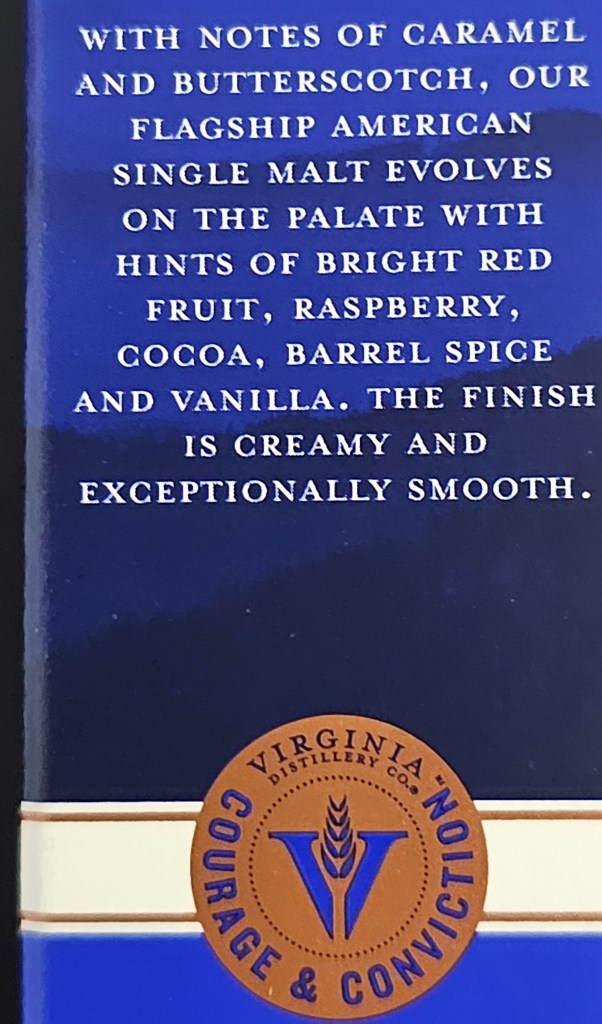 Virginia Distillery Company’s Courage & Conviction line American Single Malt Whisky is a beautiful golden yellow color in the glass, reminiscent of an apple cider or apple juice. Bottled at 92 proof (46% ABV), this whisky has, without any water being added, aromas of caramel and butterscotch that were initially somewhat muted before swirling in the glass a few times.