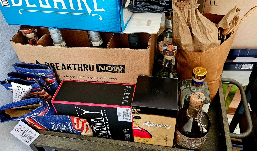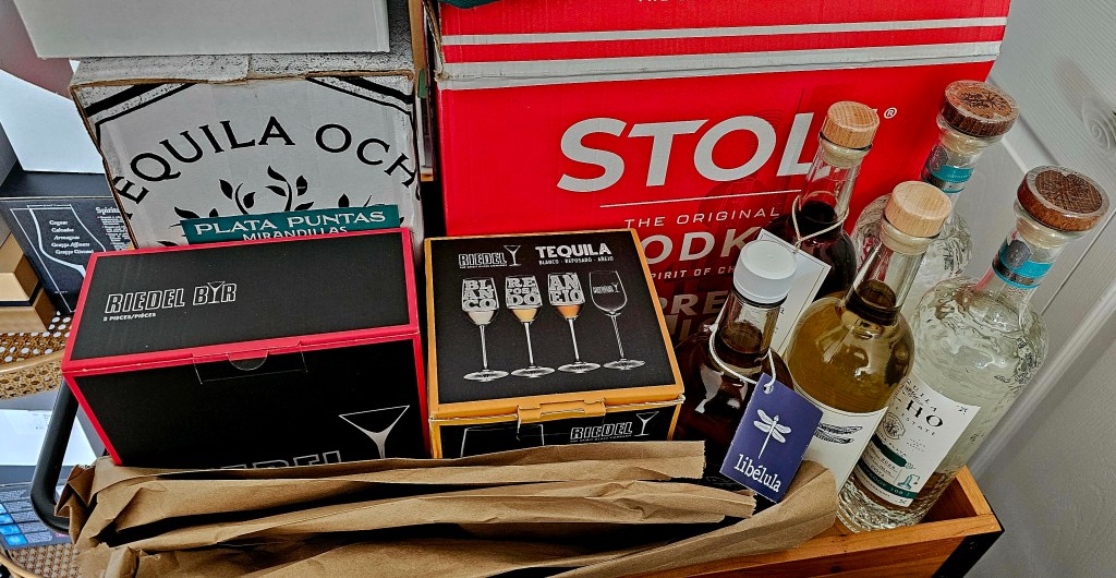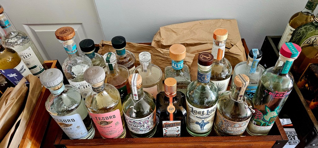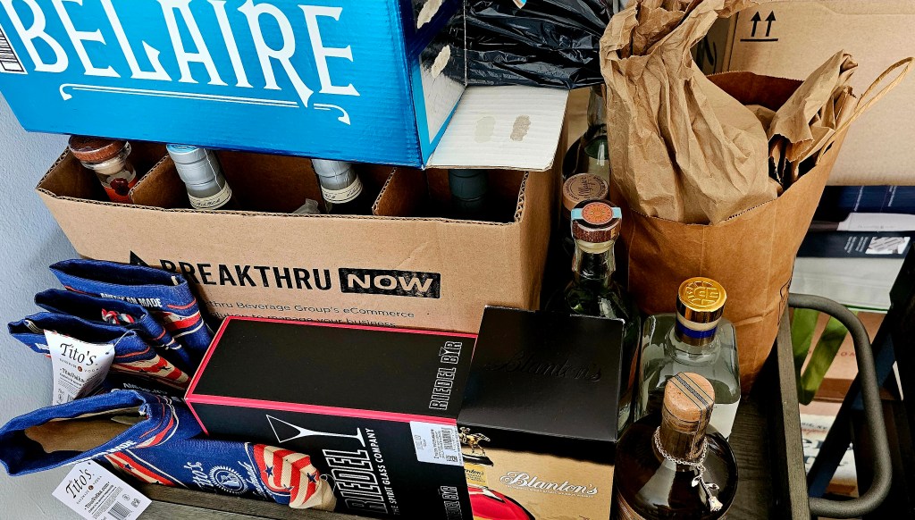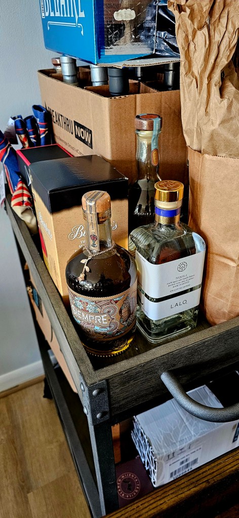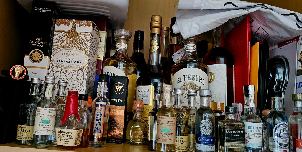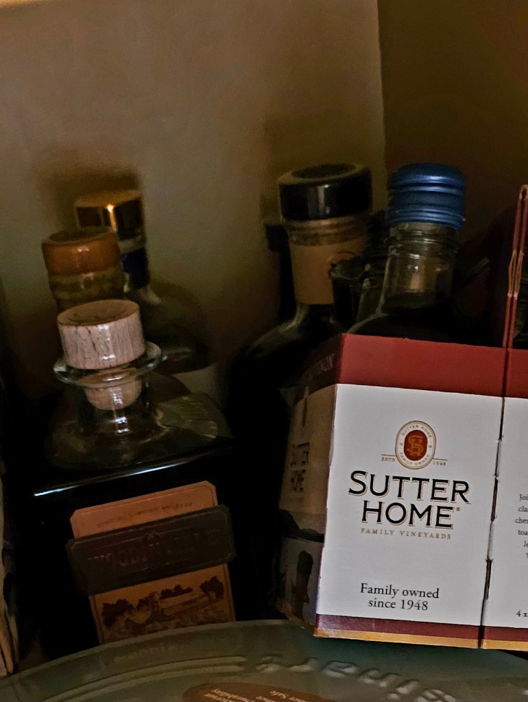 This was necessitated because I’ve pretty much used up my already limited cabinet space not taken up by kitchen tools like pots, pans, dutch ovens, extra glassware & dinner ware, dishes, plates, utensils, knives, storage containers, etc. I have one designated deep cabinet for bottles & another with bottles & a bunch of other unrelated things. There are a few shorter bottles in the back of another cabinet behind pots, Dutch ovens, & mini bottles of cooking wine I use when I cook my late Nonna’s Sunday Sauce (sugo) + some spirits shipping boxes on the floor received gratis from some kind shops.