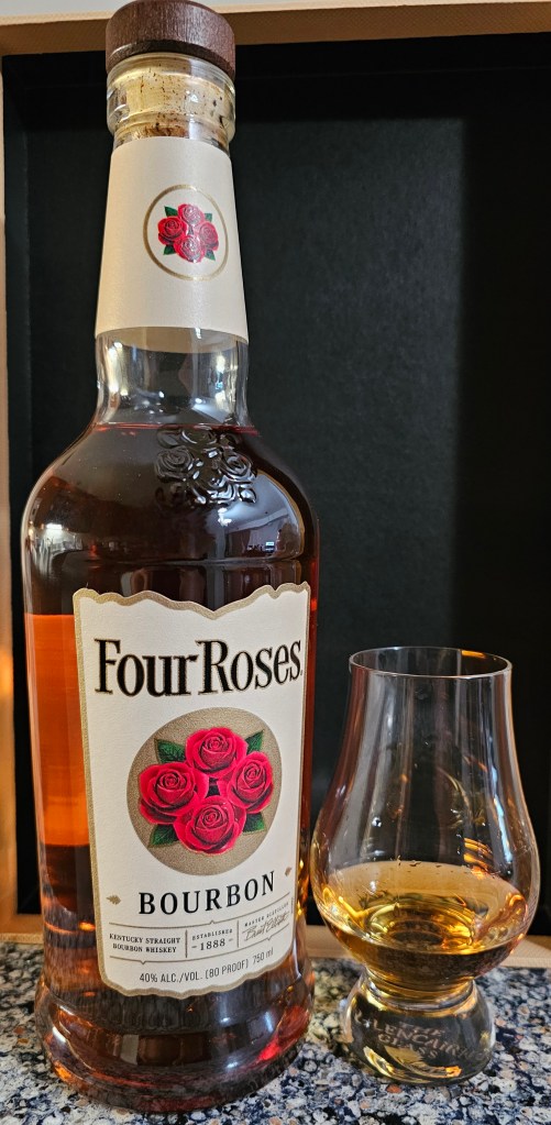 Four Roses’ standard entry-level bourbon is produced using a blend of the distillery’s ten bourbon recipes that are created using different mixes of two mash bills and five proprietary yeasts. “Mash Bill B” uses 60% corn, 35% rye, and 5% malted barley. “Mash Bill E” uses 75% corn, 20% rye, and 5% malted barley. The bourbon, like all of Four Roses’ releases, are produced using local limestone-rich water. After fermentation, the distillate is distilled using both column and doubler stills before then going for inspection to distillate holding tanks. Four Roses uses single-story rickhouses to age its bourbons in 53-gallon barrels. Four Roses entry level standard bourbon is bottled at 80 proof (40% ABV) and is aged a minimum of five years.