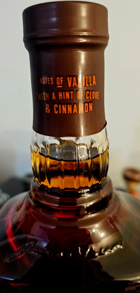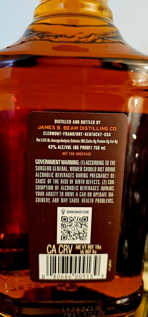 PALATE: Up front on the palate is a slightly bitter and metallic note that fades and shifts over to a dark sweetness of caramel-spiced vanilla mixed with cherries and cherry skins, dried baking spices (chiefly cinnamon, nutmeg, and cloves) that are a bit drying on the palate, and a minty English toffee note. The sip closes with a quick hit of black pepper that’s balanced by the other flavors & chiefly the dark sweet notes. The finish has a dried nut note characteristic of a lot of Jim Beam products.