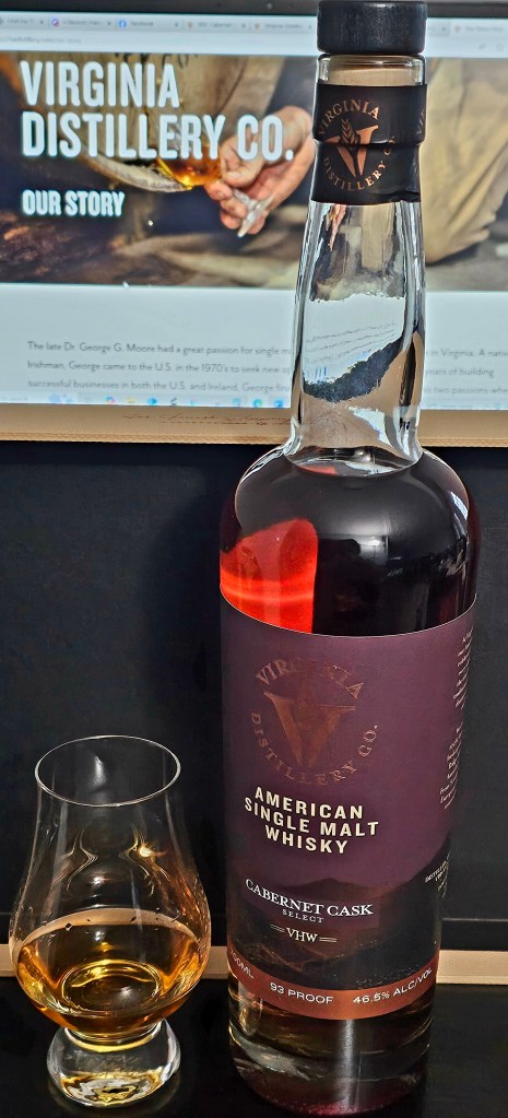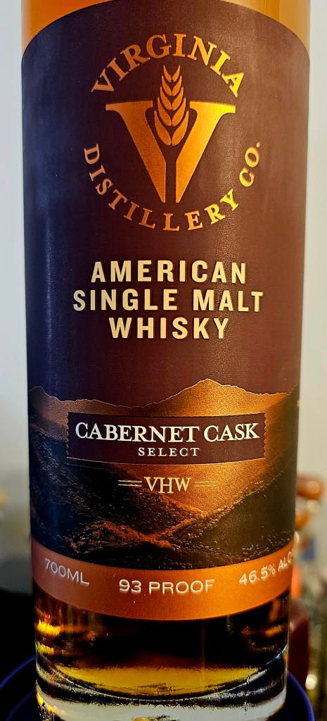 The Virginia Distillery Company (VDC) has done much to put my home state on the map for American single malts. With recently rebranded labels and a 700 ml bottle, the “VDC” series includes a number of standard shelf releases for the distillery including this VDC Cabernet Cask Select. Bottled at 93 proof (46.5% ABV) and using Blue Ridge Mountain spring water, it is made with 100% American malted barley, 2x-distilled in Scotland-made, hand-hammered copper pot stills with long necks, and is aged for a minimum of 5 years in 1st-fill bourbon barrels before being finished in French and Virginian Cabernet Sauvignon wine casks. A dark gold color in the glass, the whisky is protected from evaporation by a super snug-fitting artificial cork.