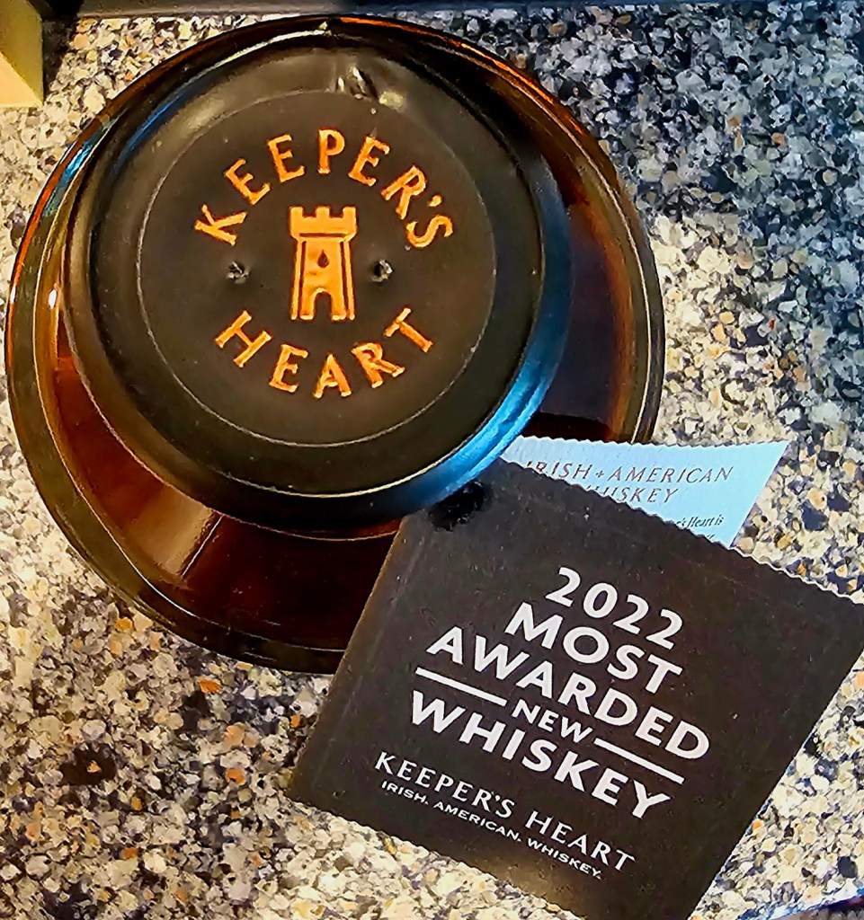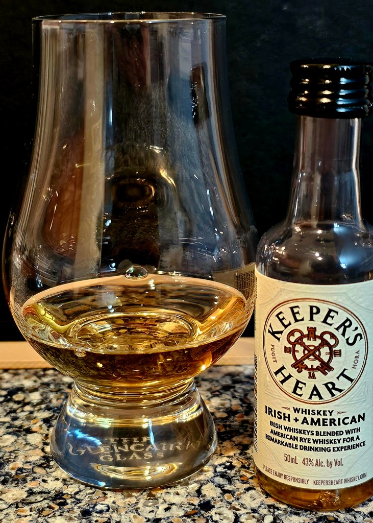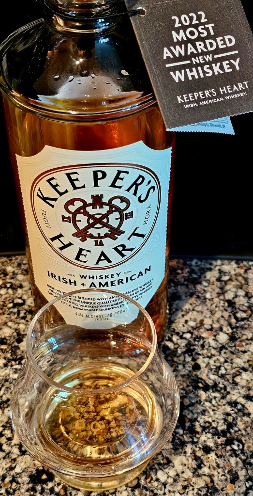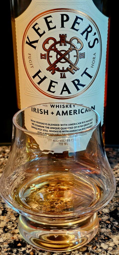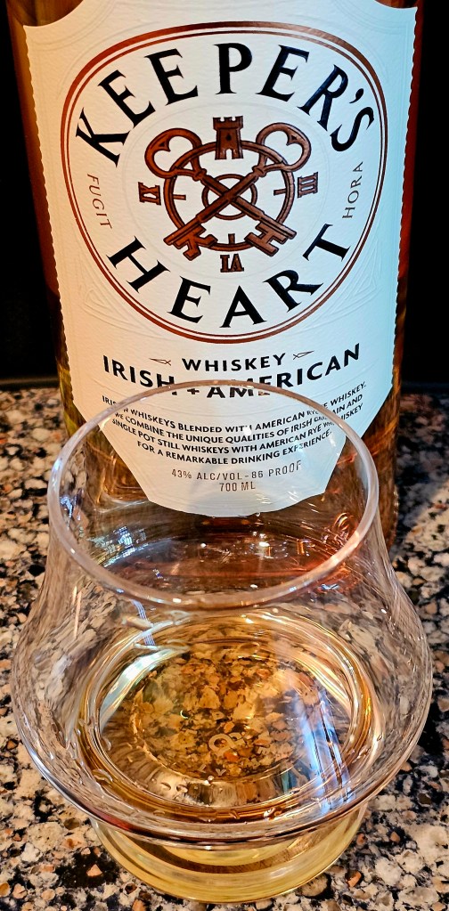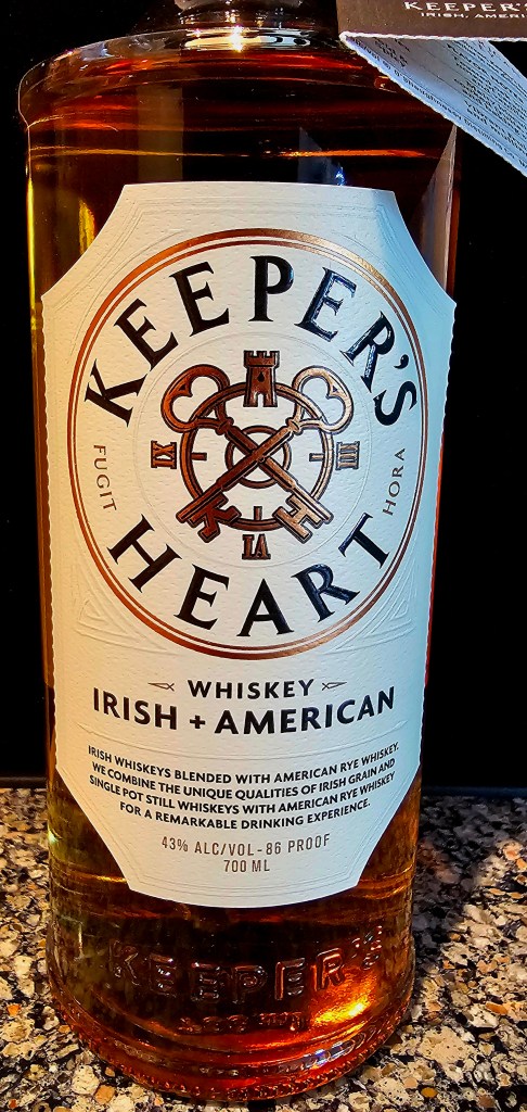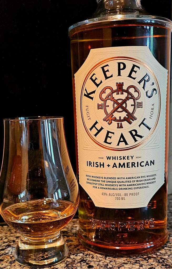 Keeper’s Heart Irish + American Whiskey is a blend of two Irish whiskies sourced from Ireland Great Northern Distilling and one (formerly) MGP (Ross & Squibb Distillery) sourced rye whisky: 53% Irish whiskies and 47% rye. The two Irish whiskies are a pot still made from 50/50 malted and unmalted barley and a 90% corn and 10% malted barley grain whisky. The rye is a 95% rye/5% malted barley mash bill. The pot still and Irish grain whiskies are aged four years in refill American White Oak ex-bourbon barrels. The rye is aged over four years in American White Oak barrels with #4 char on the staves and #2 char on the heads. The finished blended whisky is bottled at 86 proof (43% ABV).