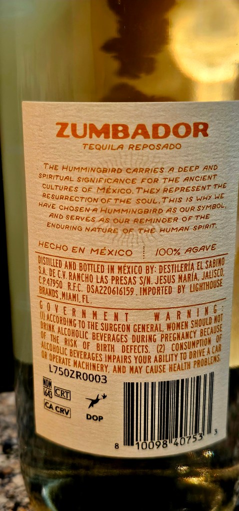 Zumbador is a new budget-friendly tequila brand produced at distillery El Sabino (NOM 1643) in Jesús María in the Jalisco highlands by master distiller Roberto Lopez Anaya, a fourth-generation agave farmer and tequila producer. The brand uses 5½-year-old Blue Weber agave grown at 6,922 feet above sea level and cooked in stone/brick ovens (hornos) before having its aguamiel extracted using a volcanic stone tahona wheel. It is fermented without agave fibers (bagasse) in wood and stainless steel tanks before being 2x-distilled in copper and stainless steel stills. The reposado is aged for 3 months in American White Oak barrels formerly used for “whiskey” (presumably bourbon). The lote (lot/batch) under review is L750ZR0003.