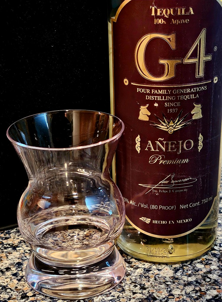 A light gold color with a medium viscous mouthfeel, G4 añejo has aromas and flavors of sweet cooked agave and baking spices (cinnamon, nutmeg, cloves), herbal/grassy/vegetal notes, citrus peel, light fruity caramel and vanilla, light oak, tropical citrus fruit, black pepper, and robust minerality. It is a light añejo, demonstrating how the specific character of the aging barrel or cask is what is most important in what profile an aged tequila takes rather than only (or even mainly) the amount of time in the barrel/cask.