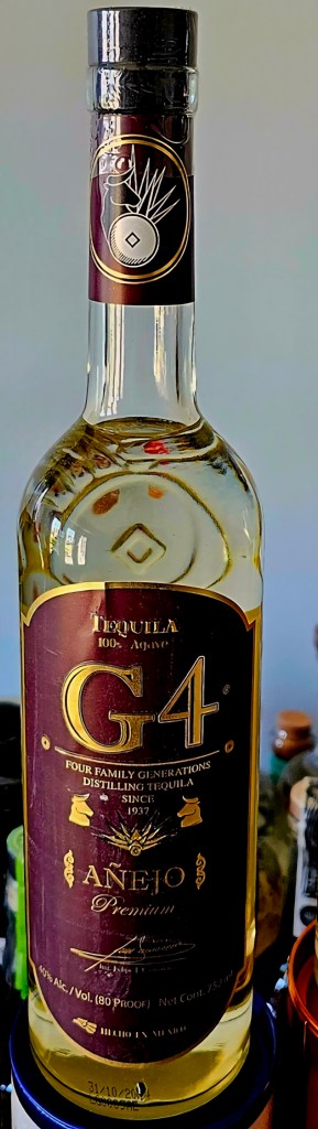 Produced by master distiller Felipe Camarena at his distillery El Pandillo (NOM 1579) in Jesús María in the Jalisco Highlands, G4 añejo is made from Highlands Blue Weber agave cooked in stone/brick ovens (hornos), its aguamiel extracted using a custom-made roller mill called “Felipestein” before being fermented in open-air stainless steel tanks followed by 2x-distillation in copper pot stills. It is then aged for 18 months in very distressed American White Oak ex-bourbon barrels, usually George Dickel Tennessee whisky barrels. It is brought to its bottling 80 proof (40% ABV) using a mix of natural spring water and rainwater.