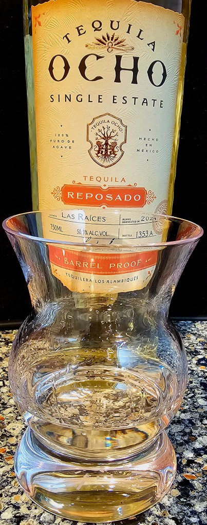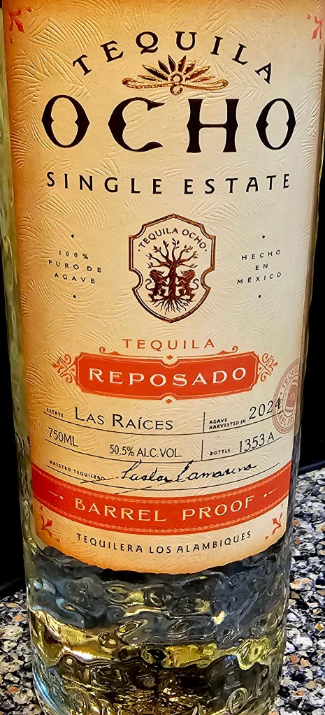 Beautifully viscous in the glass, Tequila Ocho Reposado Barrel Proof – Las Raíces has aromas and flavors of sweet cooked agave and baking spices (cinnamon, nutmeg, light cloves), chocolate, caramel, vanilla, fresh herbs (rosemary), sweet tobacco leaf, black pepper, orange peel, some fruit notes, and light oak/barrel notes. There is a kick of black pepper, and some oak tannins and barrel char on the finish.