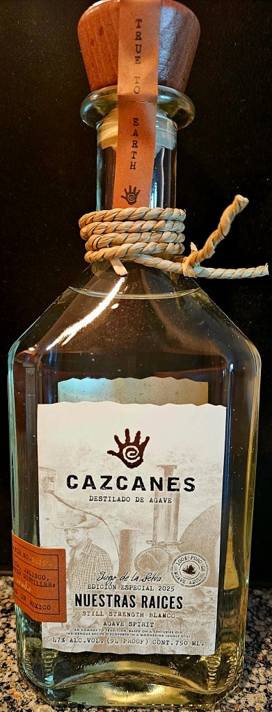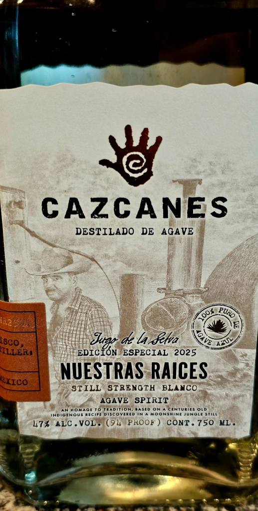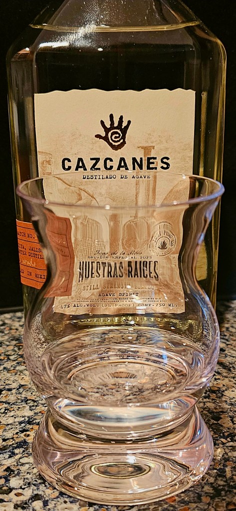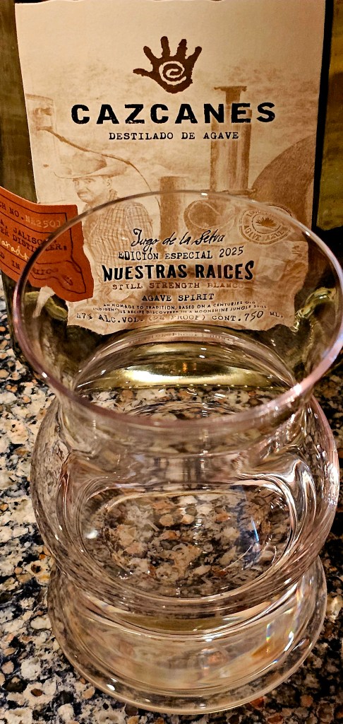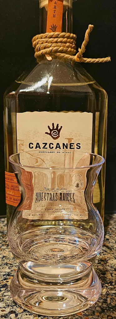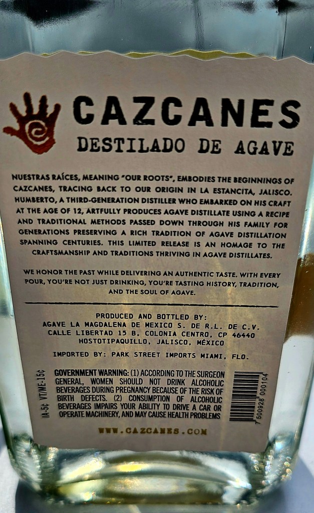 Nuestras Raíces (“Our Roots”) is a limited release from Cazcanes, a well-made and very premium-priced tequila brand, produced by master distiller Humberto Alvarado at his home distillery, Agave La Magdalena de Mexico, located in the tropical dry forest of Jalisco, La Estancita. It is neither a tequila nor a mezcal because it was not produced at an officially registered distillery for either spirit. This “agave spirit” is made from Blue Weber agave harvested in the Jalisco Valley which is then chopped by hand using axes before being cooked over direct flame in a steel oven autoclave. The aguamiel is extracted using a shredder running on a 1970s Chevrolet inline 6-cylinder engine and it’s then fermented in stainless steel tanks using natural yeast. It is 2x-distilled in a stainless steel pot still with a copper coil. It is brought to its bottling 94 proof (47% ABV) using volcanic spring water from the Sierra Madre Occidental (volcanic stone) trucked in from the Navichi Springs in Hostotipaquillo, northern Jalisco.