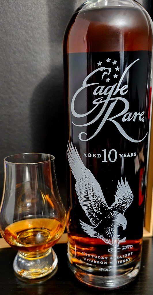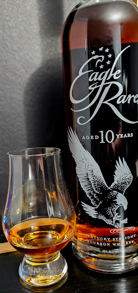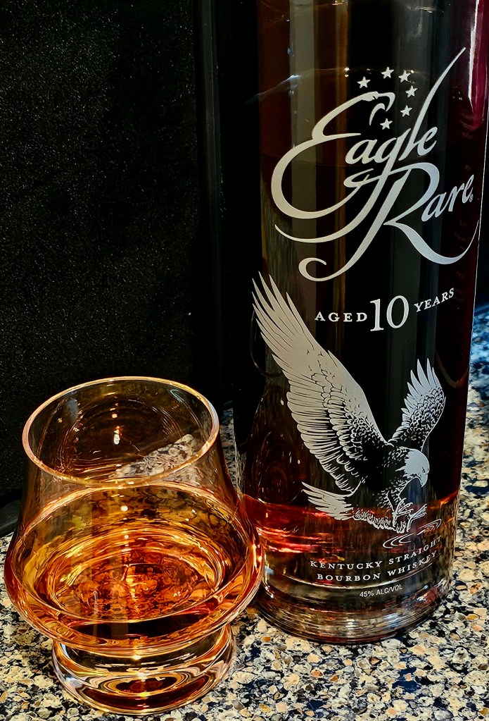 This is a review of my first bottle of Eagle Rare 10 Year, one of Buffalo Trace Distillery’s (BTD) and Sazerac’s most sought-after, actually attainable American whiskies. Made from an undisclosed mash bill rumored to be the BTD’s “Mash Bill #1” with an estimated less than 10% rye, it is aged in “Alligator charred” American White Oak barrels and bottled at 90 proof (45% ABV).