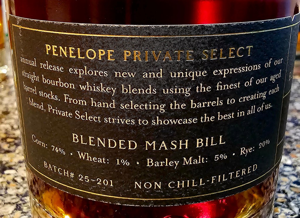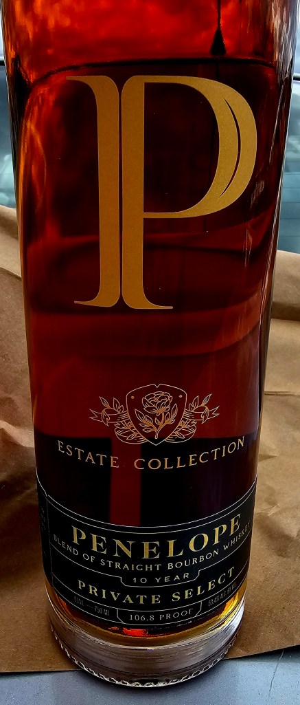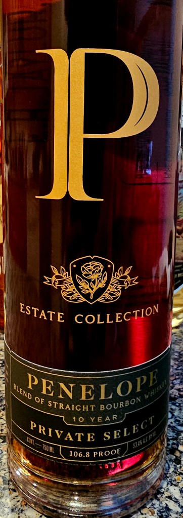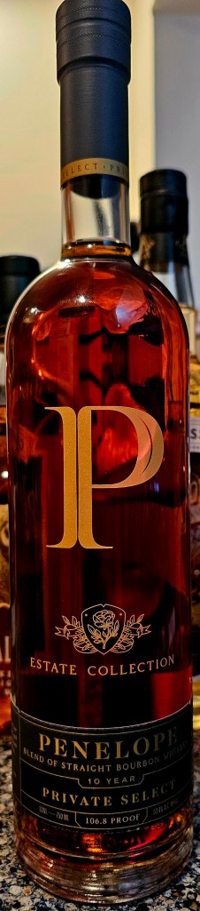 Excited to have found my very first Penelope Estate Collection bottle, the 10 Year Private Selection. A blend of hand-selected barrels, this year’s Private Select is bottled at 106.8 proof (53.4% ABV) or just shy of what’s normally considered “cask/barrel strength” (though that number isn’t set in stone and I consider bourbons around 54% and higher to be cask/barrel strength. It is made from a mash bill of 74% corn, 20% rye, 1% wheat, and 5% malted barley.