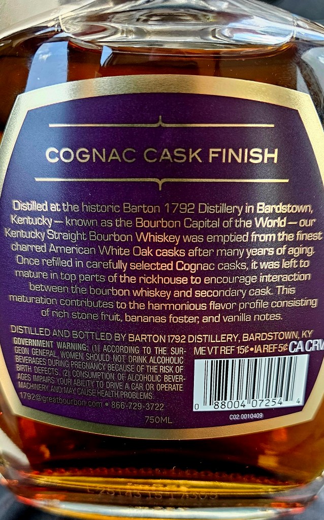 A limited release from Barton 1792, the Cognac Cask Finish has no age statement (NAS) but is a minimum of 4-years-old and is bottled at 95 proof (47.5% ABV). The mash bill is undisclosed but believed to be approximately 75% corn, 15% rye, and 10% malted barley.