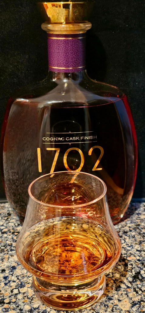 PALATE: The cognac influence also comes across strongly on the palate – Sweet grapes, dried fruits, & fresh apricots start off the sip very sweet but this is balanced almost immediately with a hit of black pepper & rye spice, creamy caramel & vanilla, toffee, oak tannins, dried orange peel, leather, a hint of cocoa, & it finishes with a mix of fruity & caramel-vanilla sweetness, black pepper & rye spice, oak, floral notes, & leather.