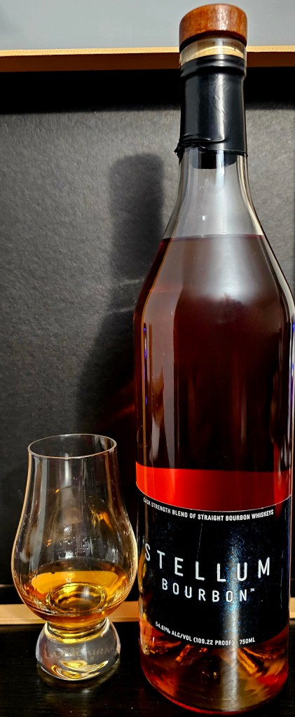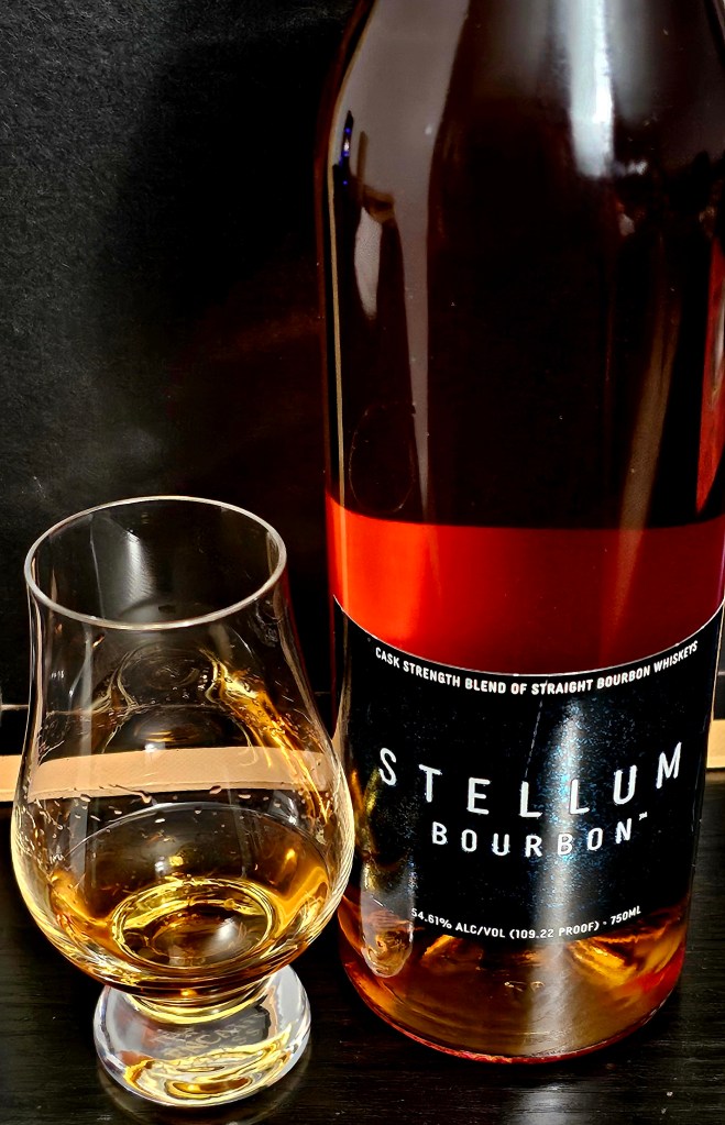 Produced by Stellum Spirits, which is owned by Barrell Craft Spirits, this cask strength bourbon is a blend of distillates sourced from undisclosed sources in Indiana, Kentucky, and Tennessee – 3 straight MGP bourbons and 2 older bourbons. Though the mash bills are undisclosed, Stellum confirms that 2 are “high rye” and 1 is “almost exclusively corn.” There is no age statement and it is chill filtered before being bottled at 109.22 proof (54.61% ABV). The bourbons are blended “slowly, through a multi-step blending process.”